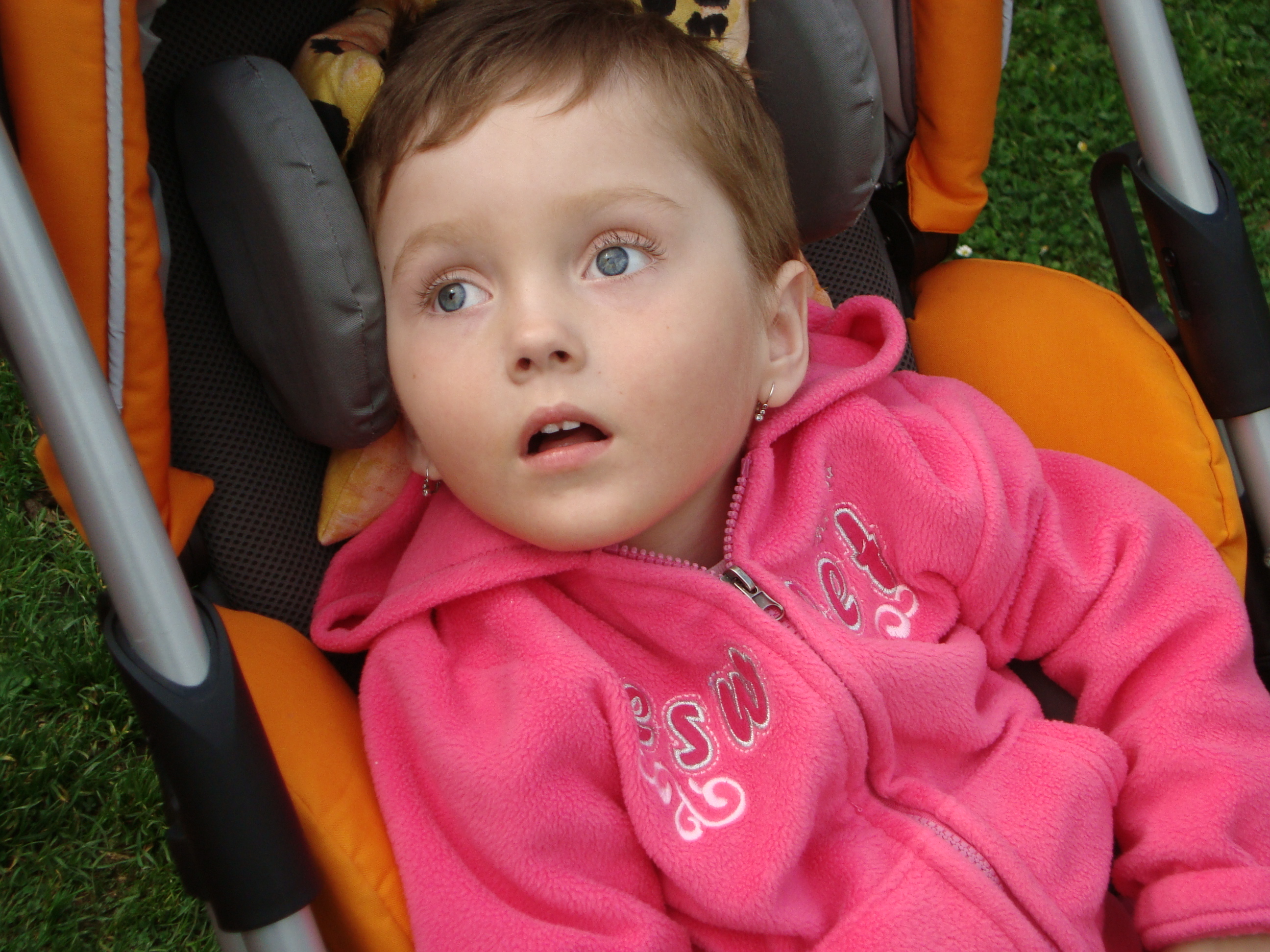 Už jsem velká holka 140 cm a 23 kg. Mám novou velikou nafukovačku, která se sama nafukuje a vyfukuje a já tak můžu jezdit na zahradu a vydržím tam celé odpoledne. Ve vozíku vydržím tak hodinku. Pak už se mi špatně dýchá...